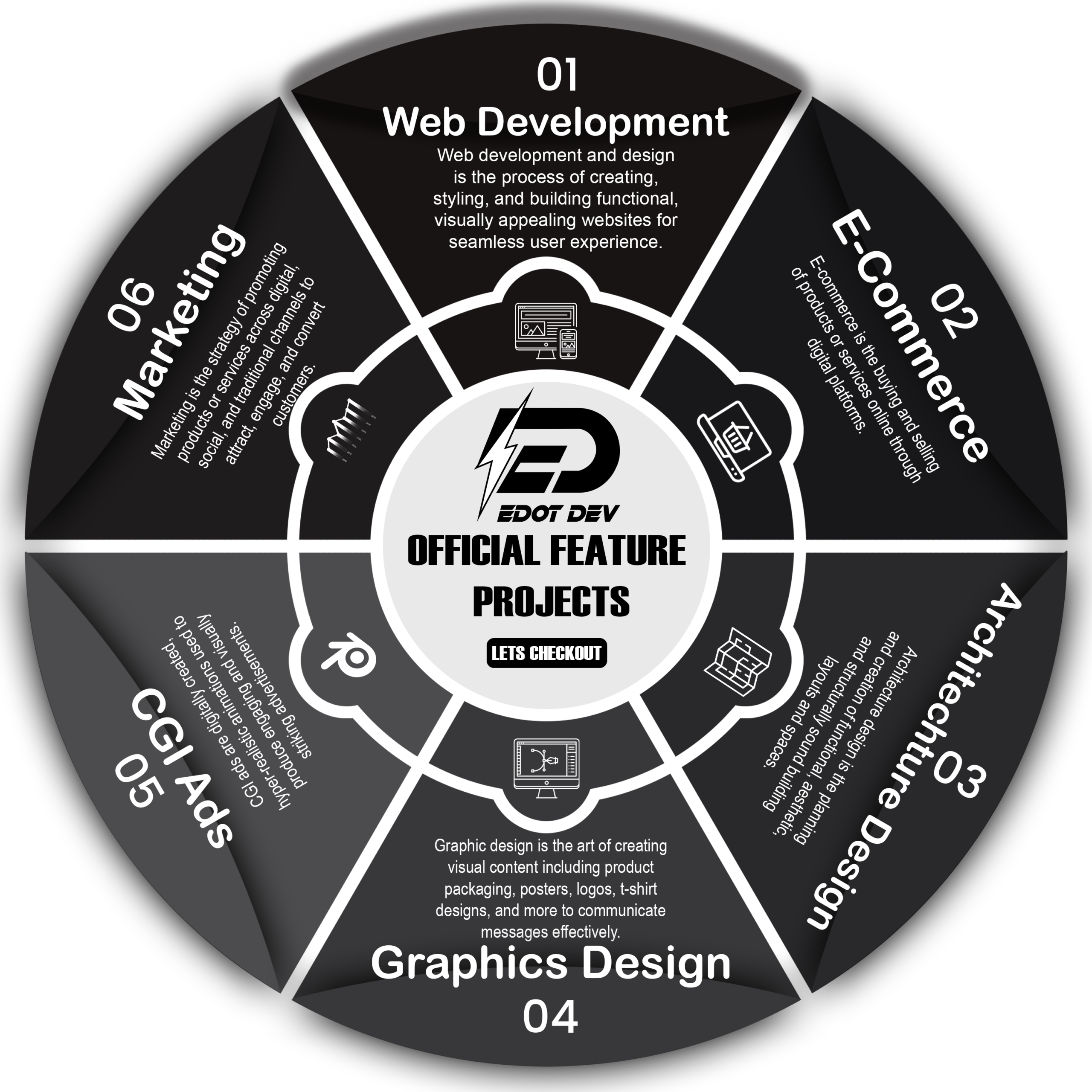 EDOT DEV offers a complete suite of professional digital and creative solutions, starting with Web Development, where we design and build modern, functional, and visually appealing websites for seamless user experiences. Our E-Commerce expertise enables businesses to sell products and services online through secure, user-friendly digital platforms. We also provide Architecture Design, focusing on planning and creating functional, aesthetic, and structurally sound building layouts. Our Graphic Design services cover everything from product packaging and posters to logos, t-shirt designs, and more delivering impactful visual communication. With CGI Ads, we craft hyper-realistic digital visuals and animations that make brands stand out with eye-catching advertising. Additionally, our Marketing solutions promote businesses across digital, social, and traditional channels to attract, engage, and convert customers effectively.
